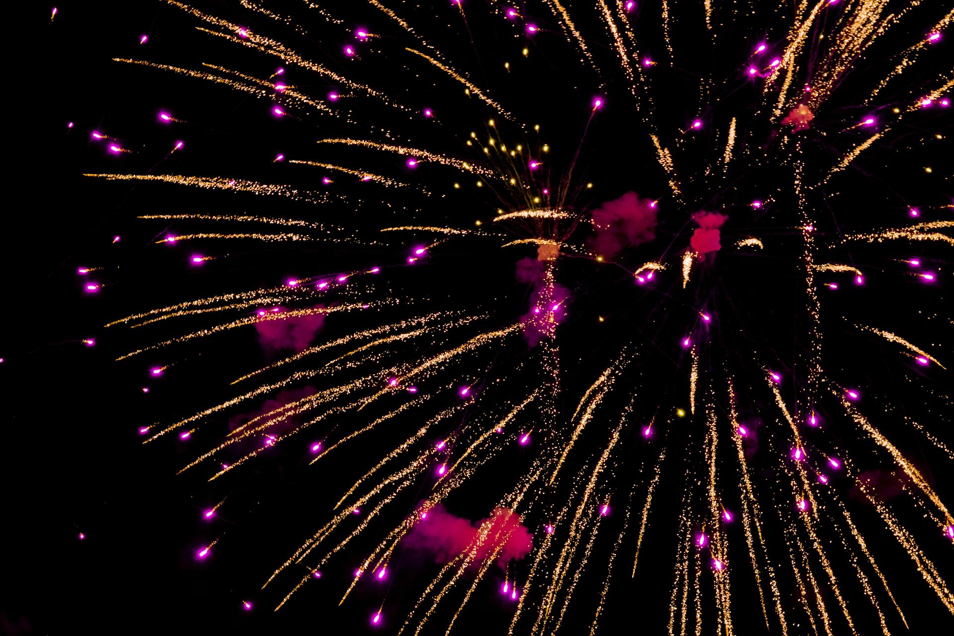 We stand there, fireworks booming overhead — bright, loud, and gone in a flash.