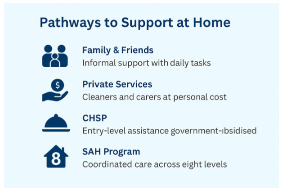 There are four key pathways to help older Australians stay at home longer. Family and friends often provide informal support with daily tasks, while private services like cleaners and carers can be arranged at personal cost. Government-subsidised programs include the CHSP for entry-level assistance and the Support At Home Program, which offers coordinated care across eight levels.